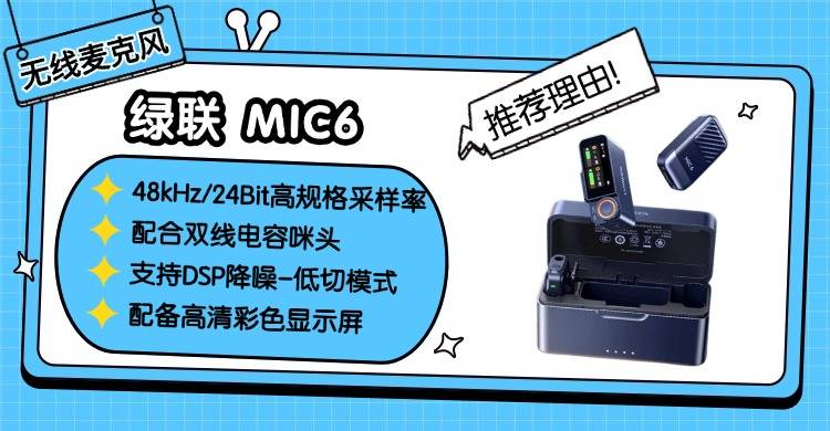 细节控直接狂喜!绿联 MIC6 这款麦克风搭载了48kHz/24Bit 高规格采样率,配合双线电容咪头,能精准还原声音细节,人声饱满有质感,音质表现达到入门专业级水准;支持 DSP 降噪-低切模式,能过滤低频杂音和环境干扰,收音纯净度很高,后期不用过多处理。还配备高清彩色显示屏,能实时显示电量、降噪模式、增益调节等参数,操作直观方便;磨砂金属背夹夹力适中且稳固,低头、转身、大幅度动作都不用担心掉落。