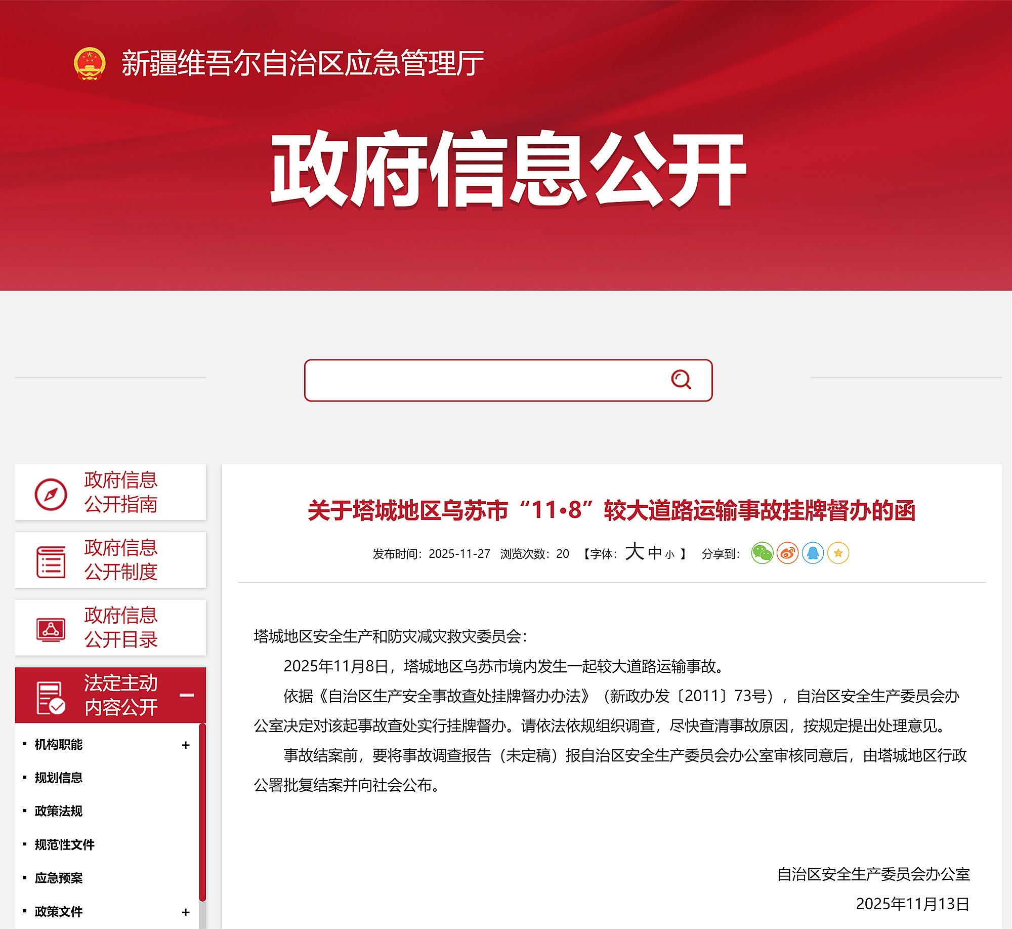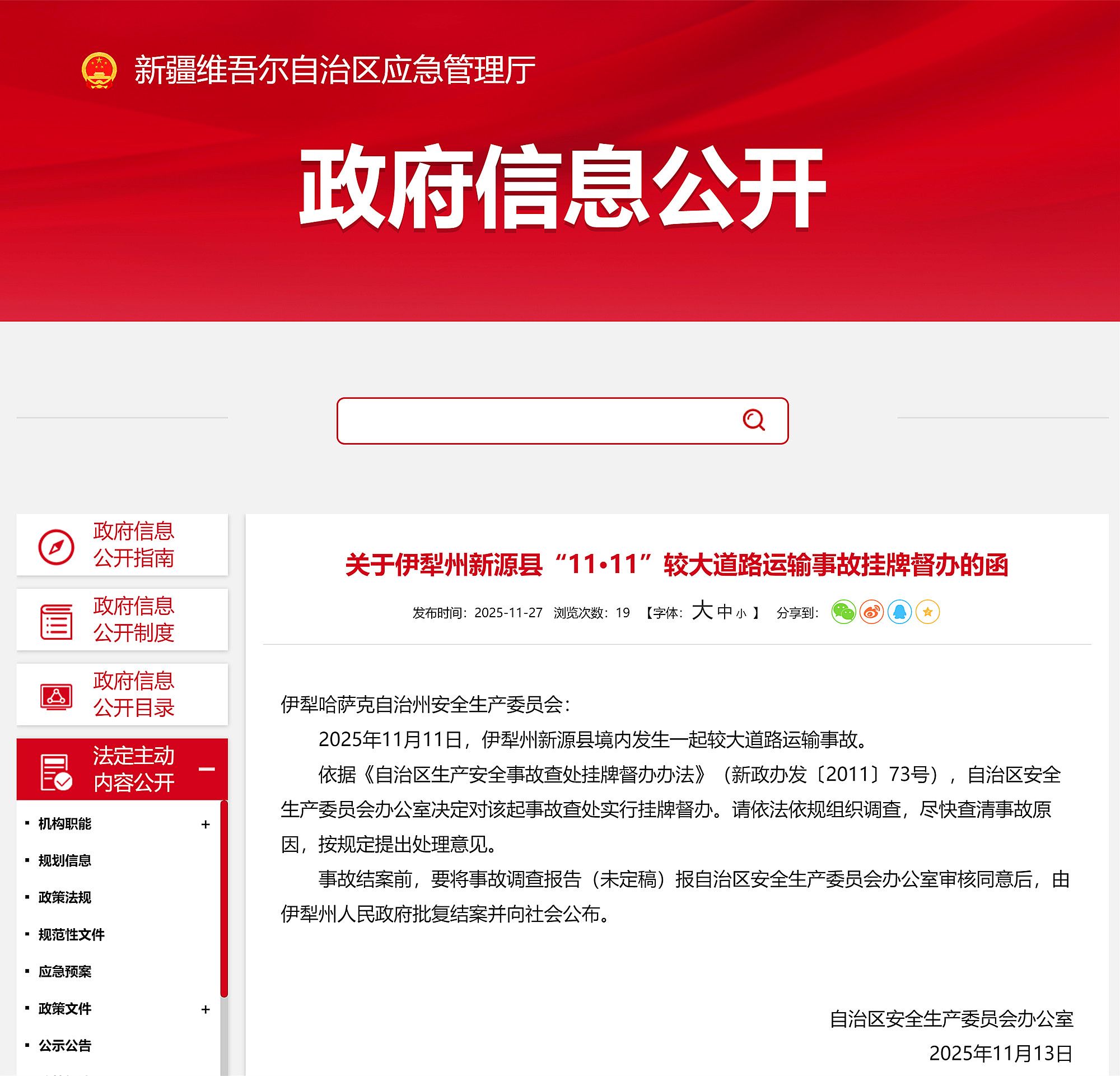 11月27日,新疆自治区安全生产委员会办公室发函,对伊犁州新源县“11·11”较大道路运输事故、塔城地区乌苏市“11·8