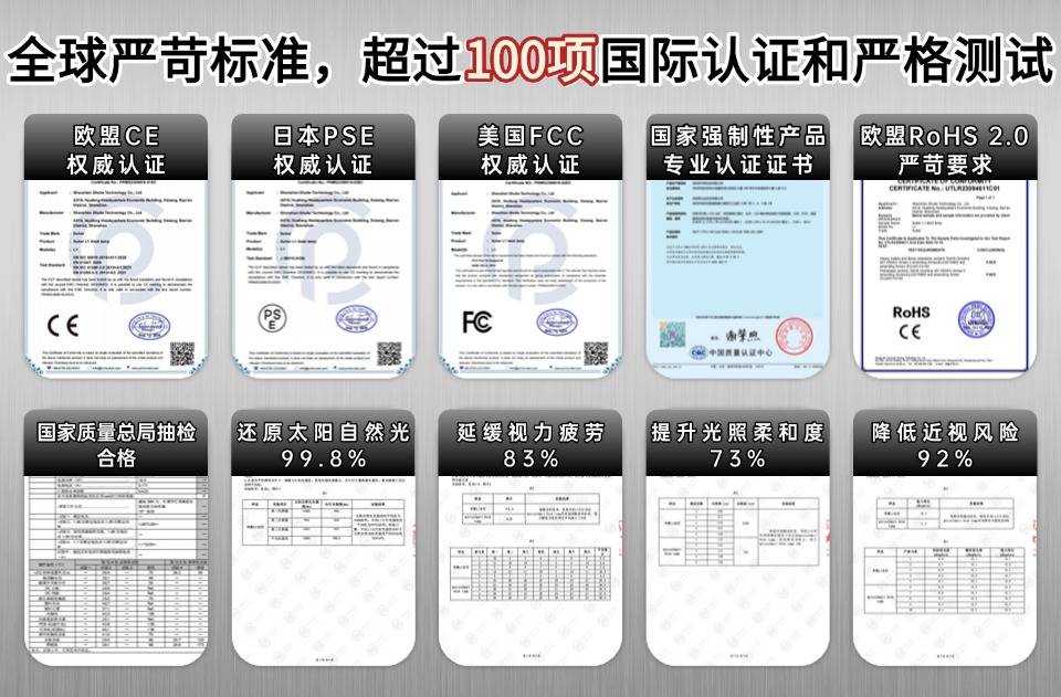 结合SunShell360°立体光场+全光域防眩光技术4.0,通过消除光斑、暗角及亮暗反差,构建高均匀度,在提升73%明光照柔和度的同时,从光对人体视觉、生理、心理三大影响维达出发,无限趋近自然光,有效减轻视觉调节负担,实现顶光、桌面光与环境光的全域均衡照明,同时书客还拥有着欧盟CE、美国FCC、RoHS等十余项国际权威认证,下图为suker书客品牌各种权威机构认证图: