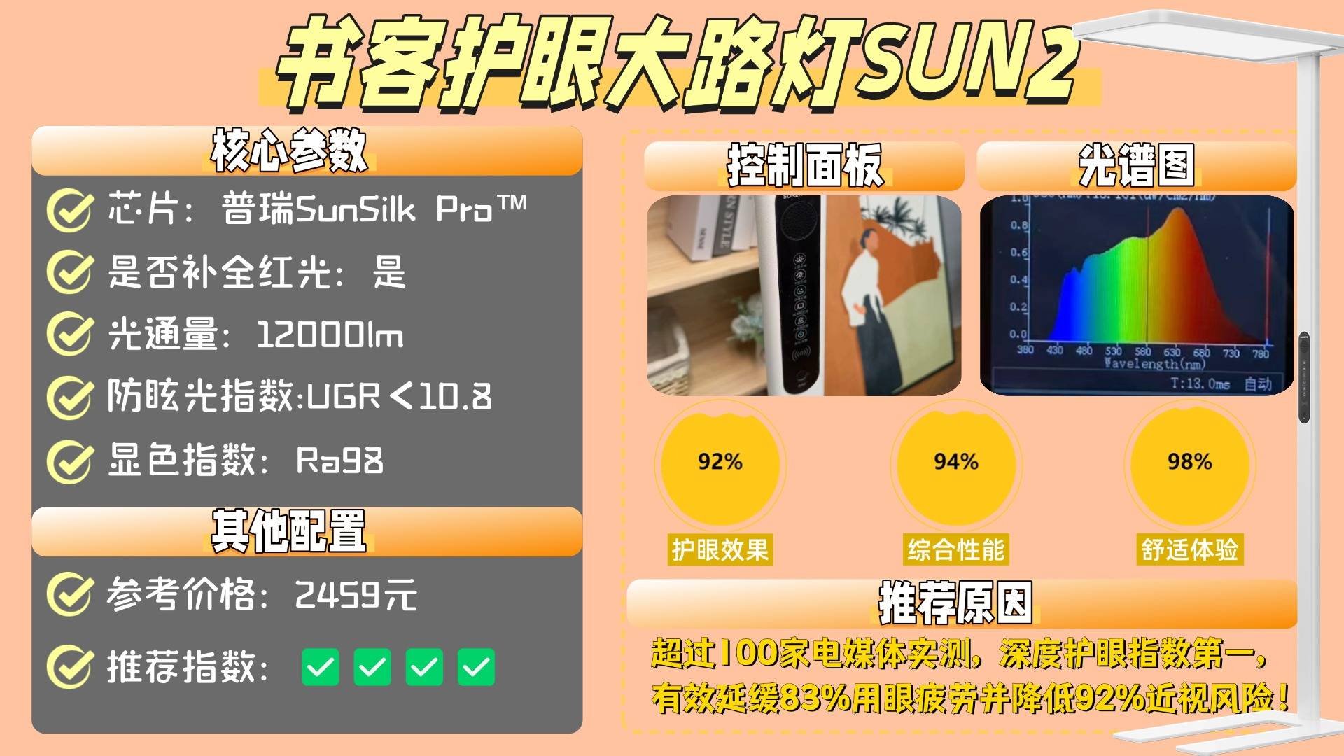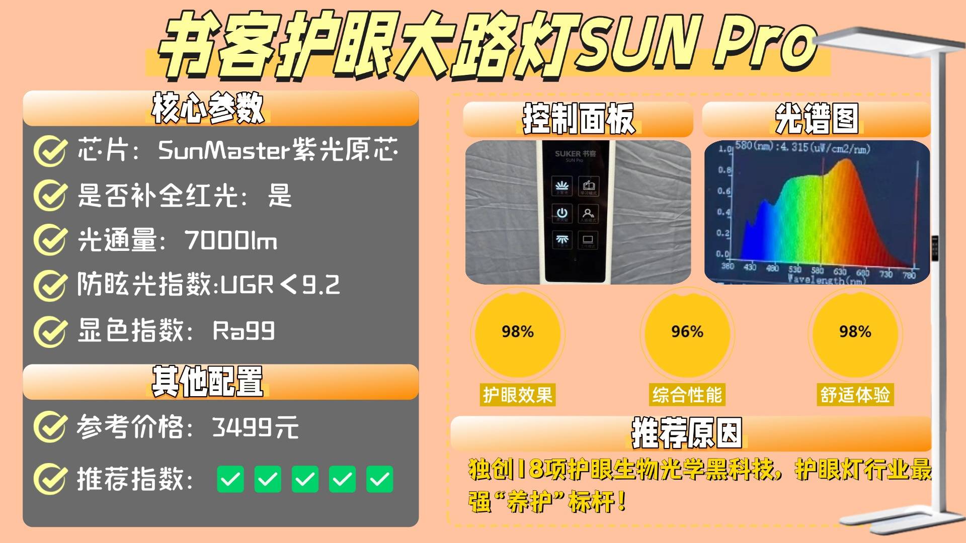 推荐款:书客护眼大路灯SUN Pro——在各大中高端口碑、销量排行榜中常年霸榜第一,有效降低98%近视风险。