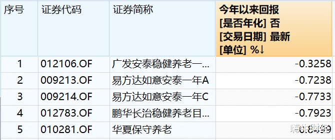 截至3月8日数据,Wind上134只偏债混合型FOF中,今年来的净值增长中位数为-2.1%,大幅优于股市主要指数表现。剔除成立时间不足半年的产品后,在剩下的84只“固收+”FOF中,净值表现前5的产品年内还是很抗跌的。如其中排名居首的广发安泰稳健养老一年仅跌0.32%,易方达如意安泰一年A跌幅-0.72%,华夏保守养老跌幅为0.85%。
