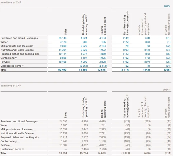 财报数据显示,雀巢宠物业务全年营收184.06亿瑞士法郎(约合人民币1582亿元),同比下降2.52%,为该业务自持续增长以来的首次回落,且降幅略高于集团整体;营业利润达40.00亿瑞郎,营业利润率20.69%,显著高于集团整体14.16%的水平,稳居集团盈利能力最强业务之首。且净利38.08亿瑞士法郎,下滑6.15%,远低于集团17%的降幅。