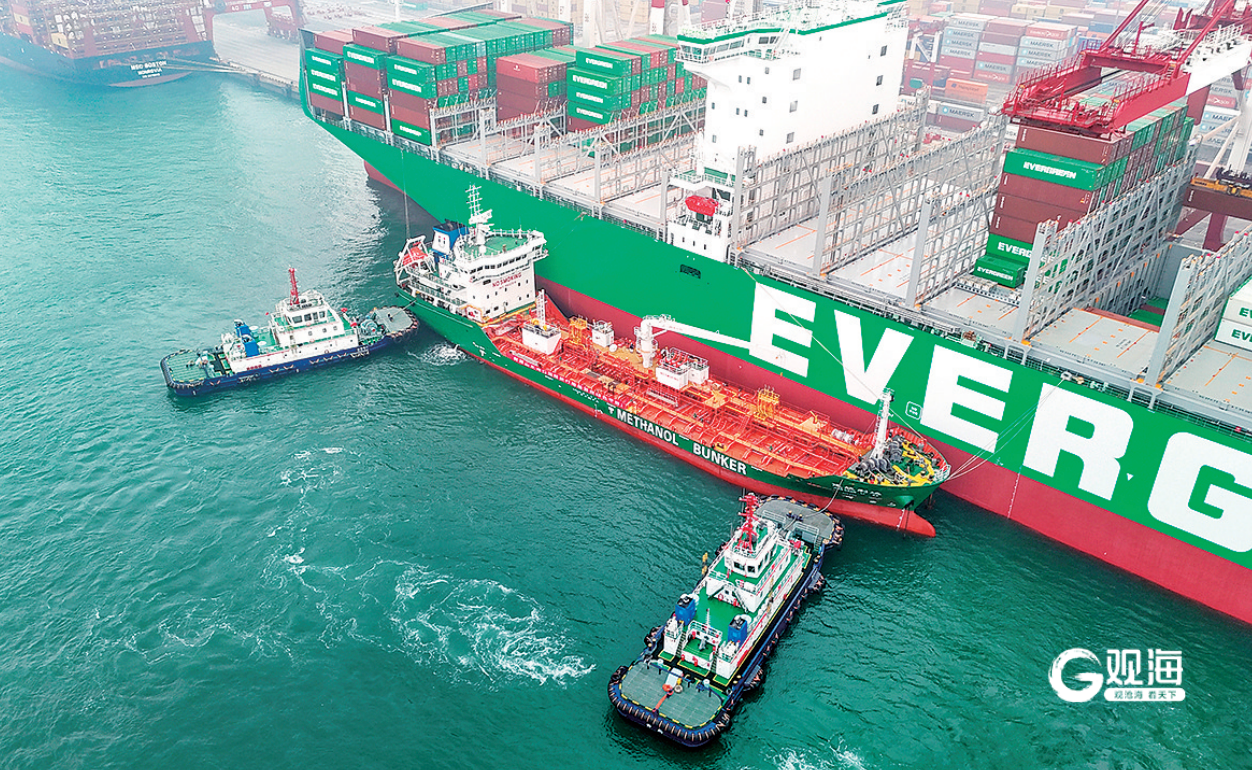 青岛港内,甲醇加注船“建航利达”轮靠近货轮准备开展加注作业。