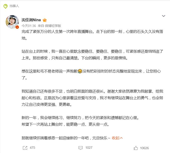舞台结束后,沈佳润的歉意来得格外及时。镜头捕捉到,她下台前特意转向毛不易深深鞠了一躬,眼神里满是愧疚,这个细节也让不少观众感受到她的真诚。1月1日清晨,沈佳润更是在社交平台发布长文,详细复盘了自己的心情:“完成了紧张万分的人生第一次跨年直播舞台,站在台上的时候,我一直在心里默念要稳住、要稳住,可紧张感还是悄悄追了上来”。她坦言下台后满是懊恼,重点向毛不易致歉:“想在这里和毛不易老师说一声抱歉,没有把彩排时的状态完整地呈现出来,让您担心了”。
