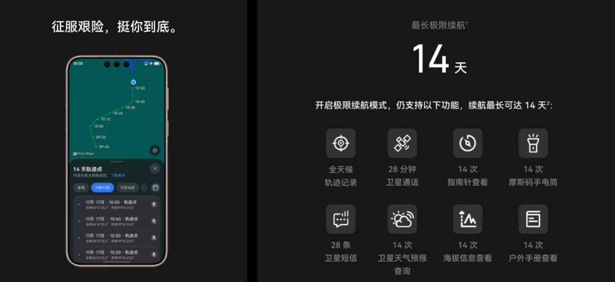 更关键的是,华为Mate 80系列的户外探索模式并非以牺牲功能来换取长续航。在该模式下,手机依然能维持全天候的轨迹记录,并支持进行卫星通话、卫星短信、天气查询、指南针与离线手册查阅等核心操作。