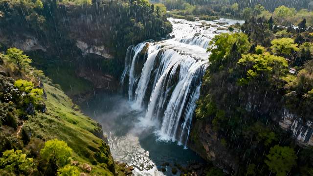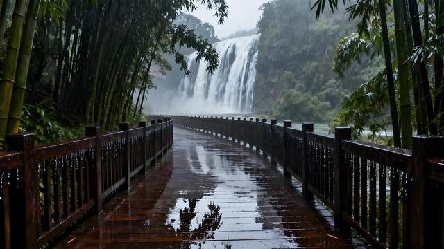 卯时,雨雾仍在山间缱绻,陡坡塘瀑布已传来低沉的嘶吼。这座宽达 105 米的 “吼瀑”,宛如黄果树瀑布群的序章,此刻正以每秒千吨的水量,在天地间铺展一幅银色巨幕。沿着蜿蜒的木质栈道徐行,雨水浸润的栏杆泛着温润的光泽,远处的钙华滩坝在氤氲雨雾中若隐若现。水流漫过滩面,激起的水花如碎玉般洒落青石板路,奏响清脆的乐章。