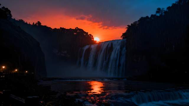 夜幕降临,雨丝渐歇,犀牛潭边仍有流连忘返的旅人。借着景区灯光,瀑布在夜色中化作流动的银带,水雾与雨水交融,空气中弥漫着负氧离子的清新。酒店露台成为绝佳观景点,远处群山在雨雾中若隐若现,瀑布的轰鸣如轻柔的催眠曲。