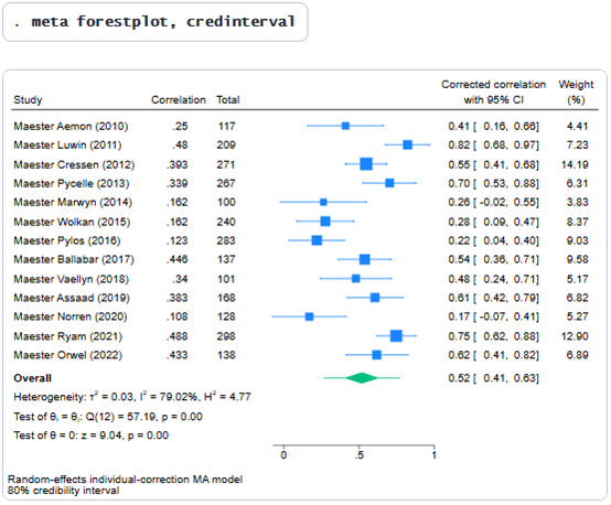 关于统计结果的其他信息说明示例,请参见[META] meta psycorr中的示例2至6。Meta分析总结与可视化结果继续使用我们对meta psycorr的第一个设定,让我们总结meta分析结果,计算总体(平均)校正相关系数,并使用选项credinterval选项显示80%(默认)可信区间。