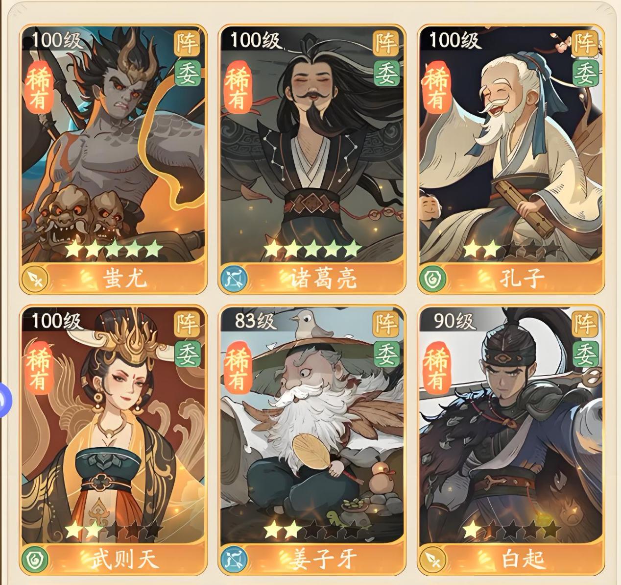 这个游戏最有特色的地方就是名士,是我们战力提升点,我这里比如说蚩尤、诸葛亮、孔子、武则天,还有关羽关二爷也是非常强力的角色,还有兰陵王和轩辕,都是非常强力的名士,强力的角色。