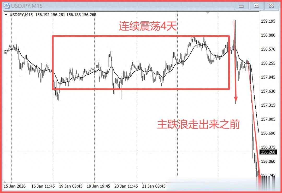 图中是美元兑日元15分钟的K线图,右侧行情从159.1下跌到155.7的这波大主跌浪走出来之前,行情在155.8~157.6的小空间里连续震荡了4天。
