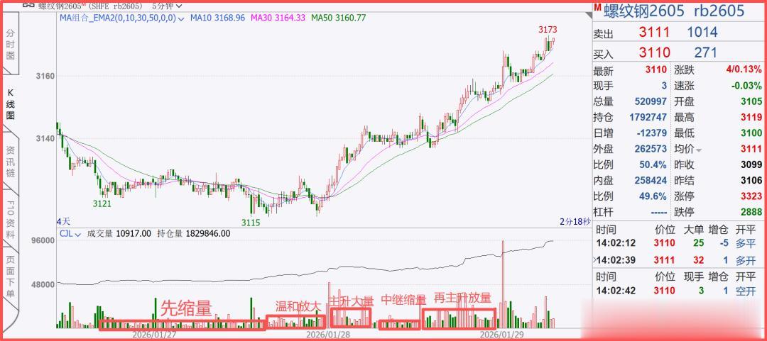 图中是螺纹的K线图,伴随着下跌结束,成交量整体开始萎缩,价格维持在区间,在震荡的尾端行情探底3115之后,行情开始温和放量,这是主升浪即将到来的信号。