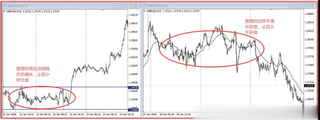 图中左右两侧都是英镑15分钟的K线图。