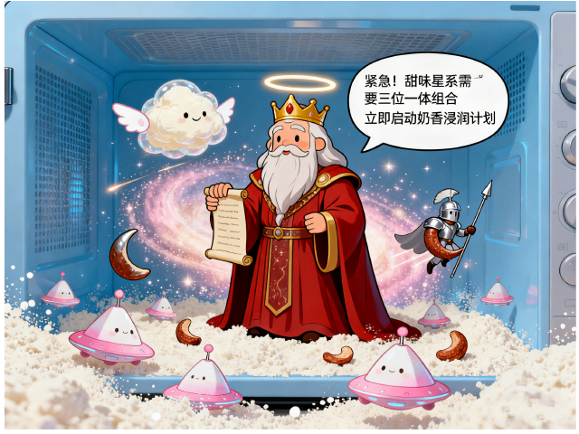 穿着红枣战袍的古老智者,在点心宇宙的轨道上发出召集令:“紧急!甜味星系需要三位一体组合”,“立即启动奶香浸润计划——”