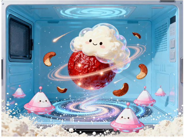 乳白色奶芙云朵缓缓包裹红枣行星,腰果碎片如流星环环绕飞行。在微波炉里经历三次空间折叠,最后撒上乳粉制造的银河星尘,每个都变成胖乎乎的三角飞船。