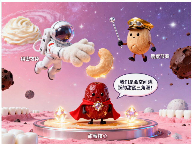 每个泡枣都是:【奶芙宇航员】主导绵密攻势、【腰果导航员】掌管脆度节奏、【红枣指挥官】守护甜蜜核心。三位在点心宇宙形成稳定三角,顺便把人类口腔当作新星系探索。