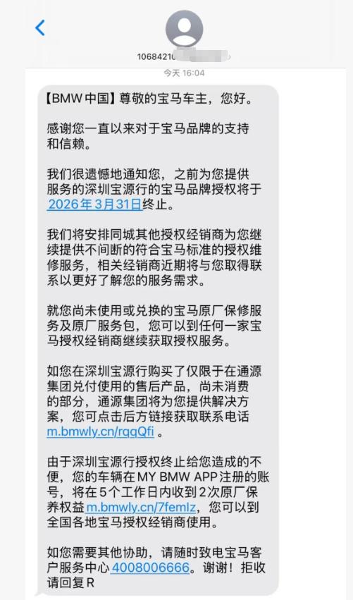 然后,BMW中国发给车主的服务短信中称,宝源行母公司贵州通源投资集团有限公司将被终止宝马品牌授权。