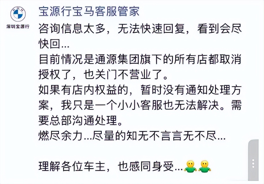 这还只是冰山一角,从去年开始,通源集团的多家门店就陷入密集的“调整期”,宝源行宝马4S店客服,在回应车主的内容中透露,“通源集团旗下的所有店都取消授权了”。