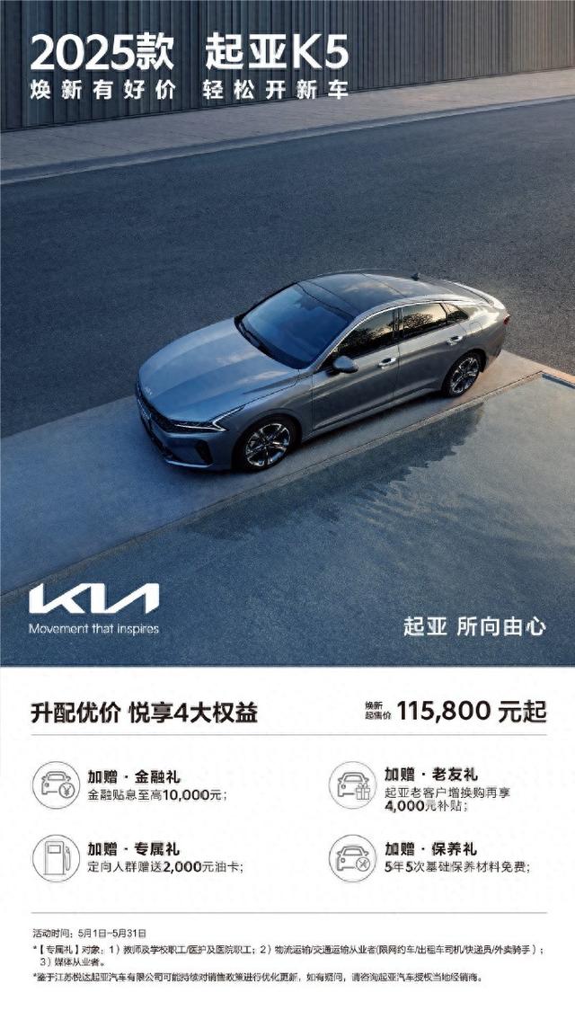 不过从5月最新行情来看,绷不住的韩系车也开始发力了。以起亚为例,在5月,起亚一系列车型都给出了诚意可观的“焕新价”。如2025款起亚K5,焕新价就来到11.58万起,同时还可享受至高10000元贴息、老客户增换购4000元补贴、5年5次基础保养材料免费等权益。