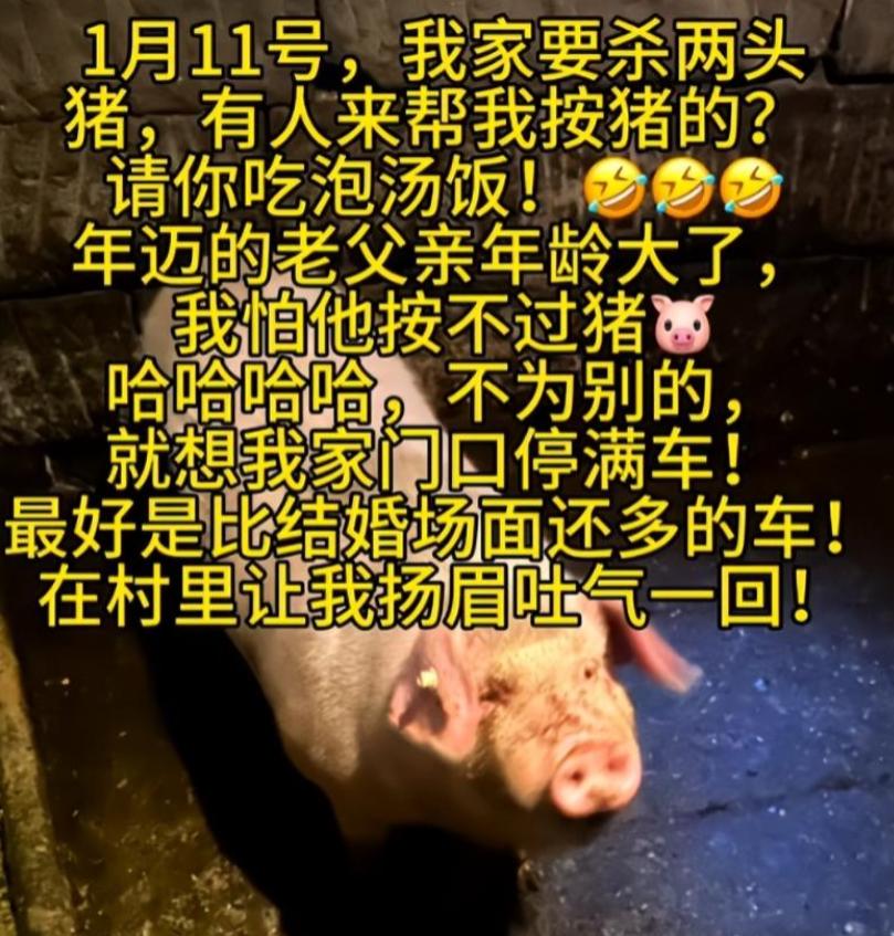 她说家里11号要杀两头年猪,可父亲年纪大了没力气按住猪,想找网友来搭把手,只要来帮忙,就请吃热乎的刨猪汤。