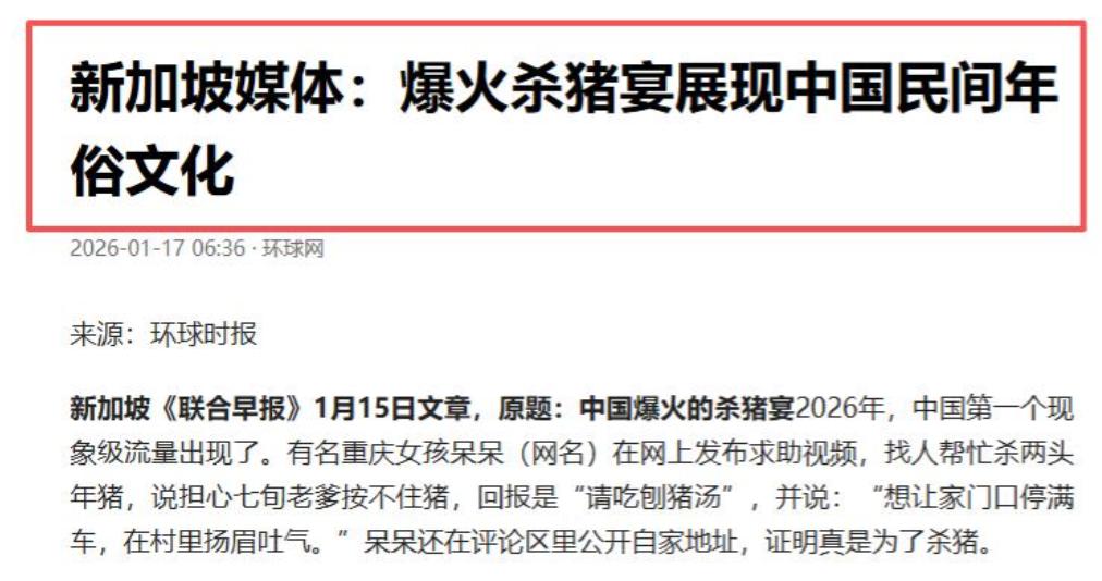 这股热闹劲儿还传到了国外,1月15号,新加坡《联合早报》专门发文,说中国这场爆火的杀猪宴展现了民间年俗文化。