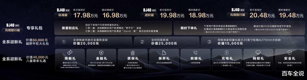 自此,BJ40增程家族一共拥有标准版、进阶版、元境智行版三个版型。北京越野还带来了BJ40增程三个版型均能享受的两大全系迎新礼。