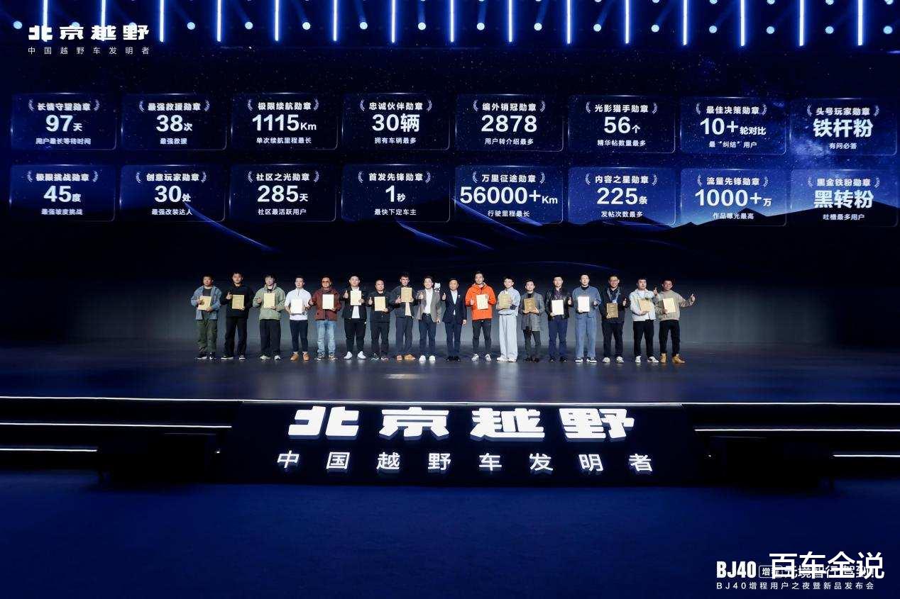 北汽集团董事长张建勇为BJ40增程“车主之最”用户颁奖。16位获奖用户包括等车时间最久用户、行驶里程最长用户、一箱油单次跑出最远里程用户等,他们用一个个动人的故事,让BJ40增程不仅仅是一台车,更成为一种文化,一种精神符号。