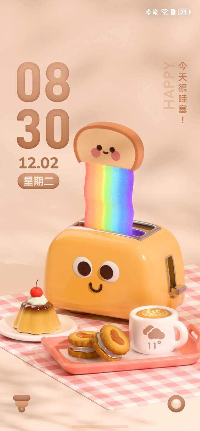 除了「Q弹情绪向右滑」主题,我又试了下「早安」主题,它也能感知表情,对着屏幕笑一笑,那个烤吐司机竟然拉出了彩虹!据说如果你心情低落,双击它还会有解压的疗愈交互,这种不需要开口,仅仅一个微表情就能被手机“读懂”的感觉,真的很奇妙。