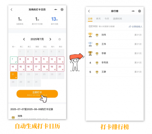 同时支持查看班级打卡排行榜,营造积极向上的打卡氛围,激发学生的打卡积极性。