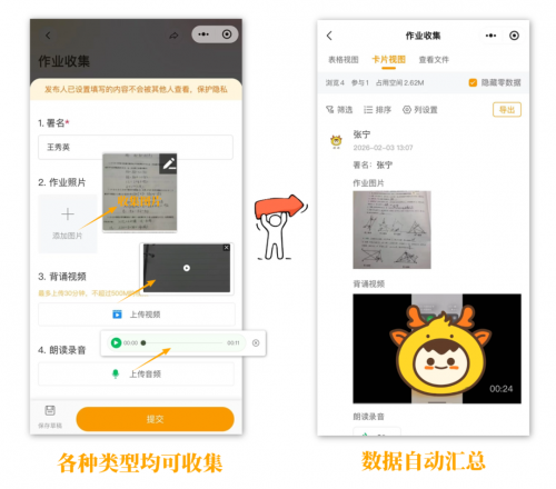 全面适配各类寒假作业需求,既能轻松收集语数英主科作业——比如语文默写、数学习题、英语阅读与听写等,也能完美兼顾劳动实践、体育锻炼、朗读背诵等特色任务,所有作业一站式管理,告别杂乱无序。