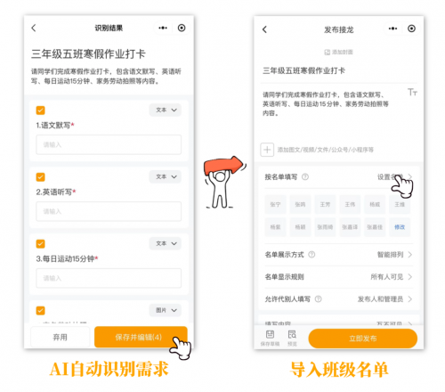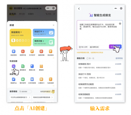 一句话描述需求,AI自动生成接龙,比如:“创建三年级五班寒假作业打卡,包含语文生字默写、英语课文背诵、每日运动15分钟、家务劳动拍照”,AI会精准识别核心需求,自动生成标准化作业打卡接龙。