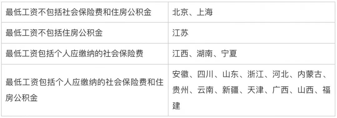 注:其中安徽、四川、山东规定最低工资包含劳动者个人应缴纳的社会保险费和住房公积金,浙江、河北、内蒙古、贵州、云南、新疆则明确最低工资包含劳动者个人缴纳的养老保险、失业保险、医疗保险和住房公积金。
