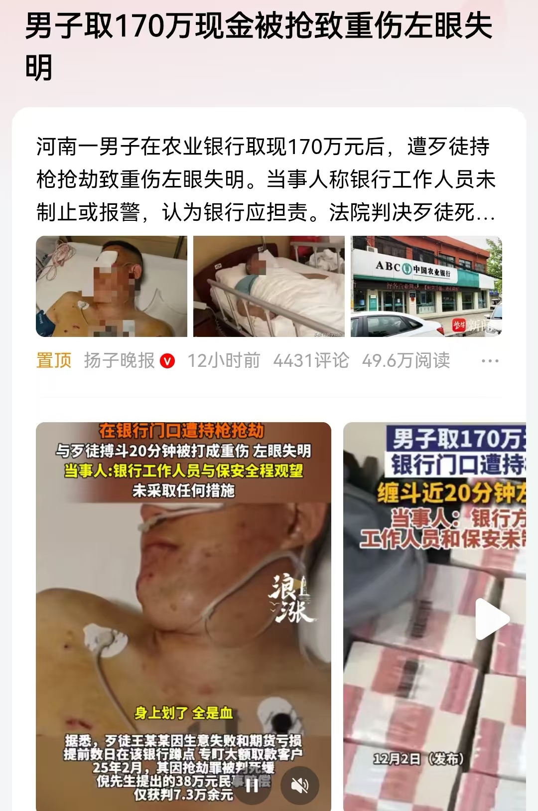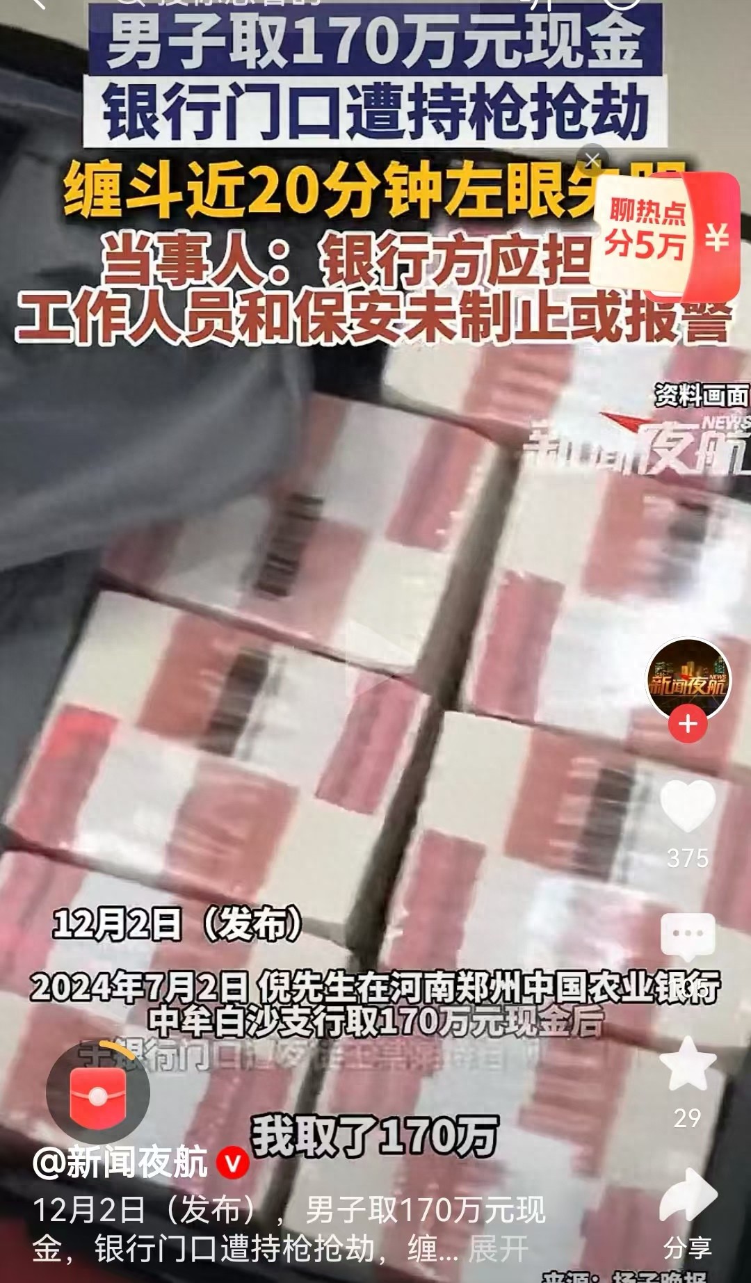 最近发生一起案例,影响很大,到现在也未平息,储户倪先生还在奔走投诉的道路上奔波,他能成功吗?原来在2024年7月2日,他在河南中牟县某银行大额取款170万元现金,取款完毕刚刚走出银行,在距离银行门口几米远的道路上,还没有上路边的私家车,就遭到了歹徒持枪抢劫。歹徒连续打击,迫使倪先生放手拿钱的箱子。