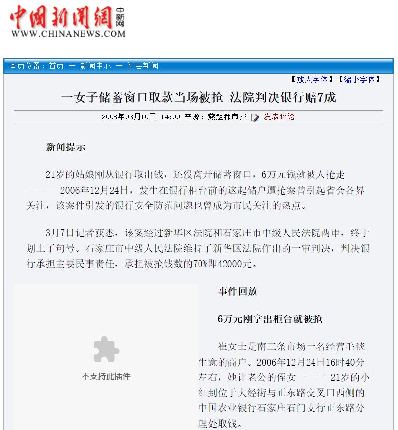 在过去也有一些案例,假如储户是在银行营业场所内遭遇抢劫,银行确实会承担责任,而且承担的比例会越来越高。例如2006年,河北石家庄一位21岁的姑娘刚从柜台取出钱,就被抢夺了6万元钱,最终一审判了后,银行起诉,最终二审宣判,银行承担主要民事责任,承担被抢钱数的70%即42000元。
