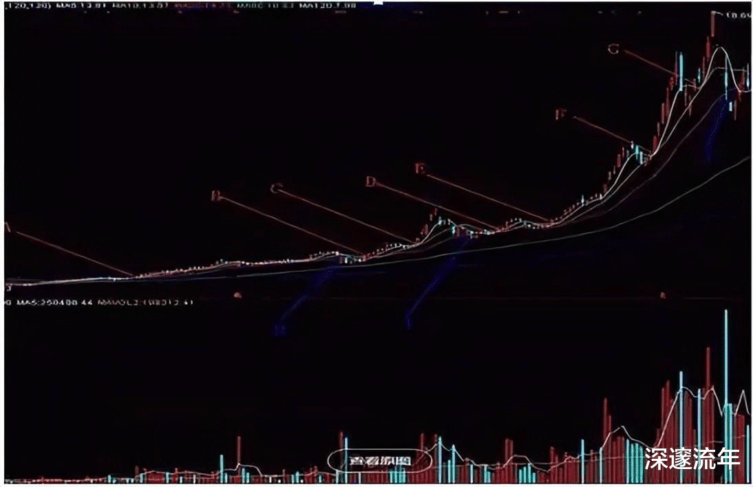 先定义“五线”是5、10、20、60和120日平均线,“三线”是5、10和20日平均线。中A点是本轮行情中K线第一次爬到五线之上,作买入。