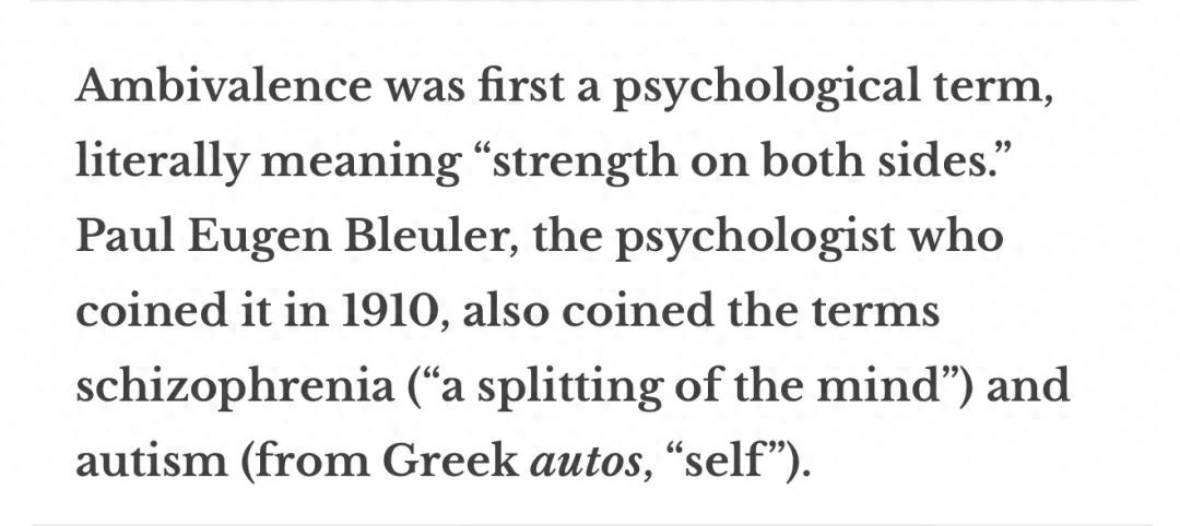 出自名词 ambivalence,该名词最初是一个心理学术语,字面意思是"双方的力量"。该词由瑞典精神病学家保罗·尤金·布洛伊勒 (Paul Eugen Bleuler) 于1910年创造,他还创造了schizophrenia (意为"心智的分裂") 和 autism (源于希腊语 autos,意为"自我") 两个术语。