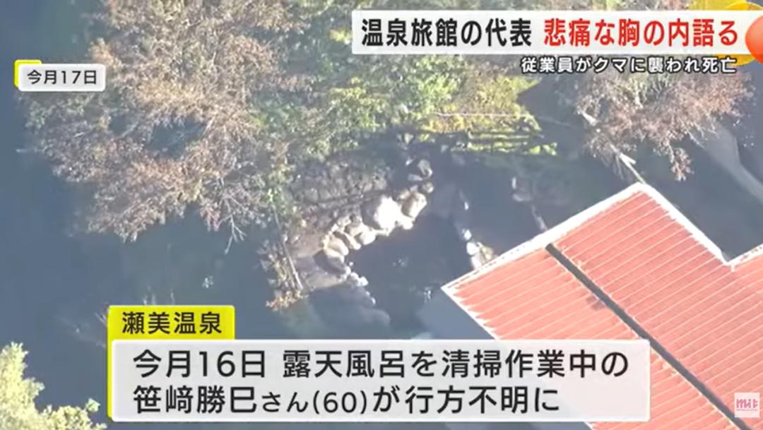 最恐怖的是岩手县16号的温泉袭击事件,60岁的工作人员胜巳在清理露天温泉时失踪,尸体最终在山林里被发现。