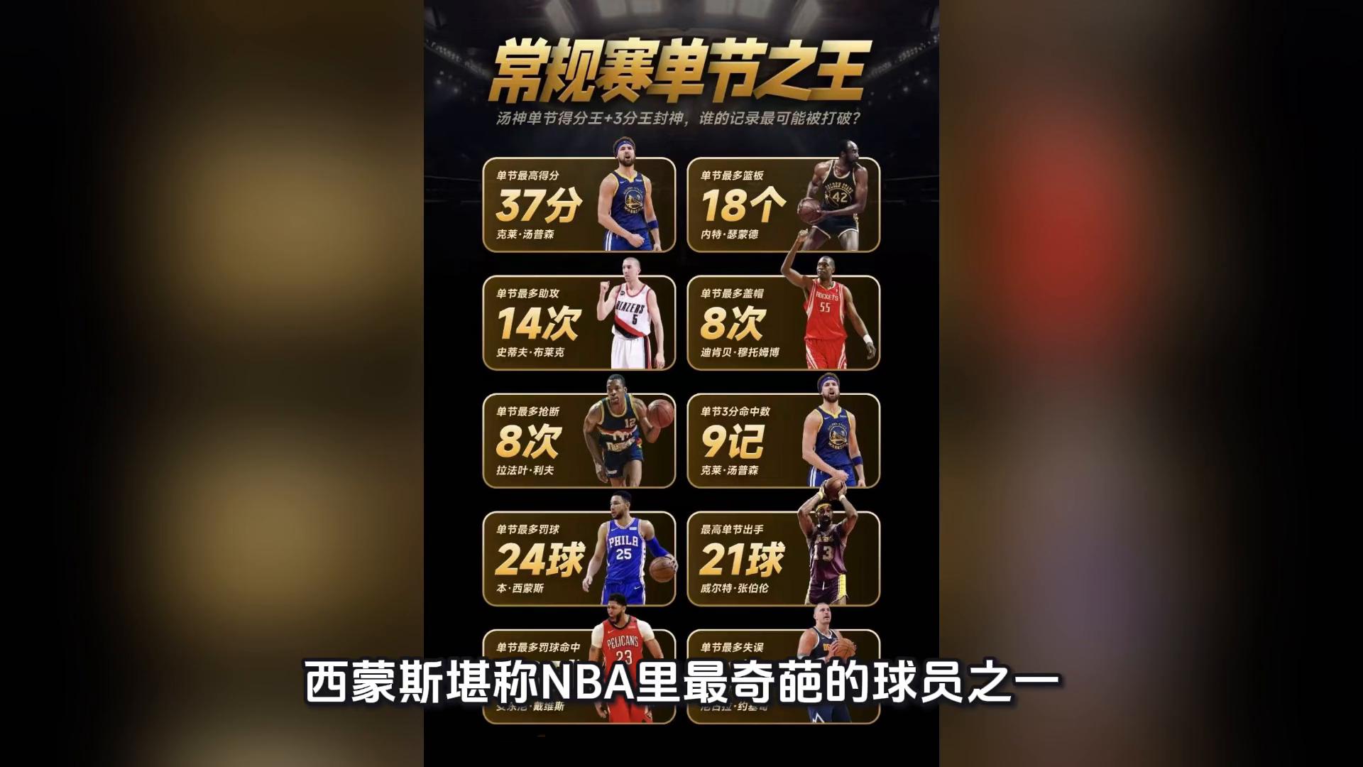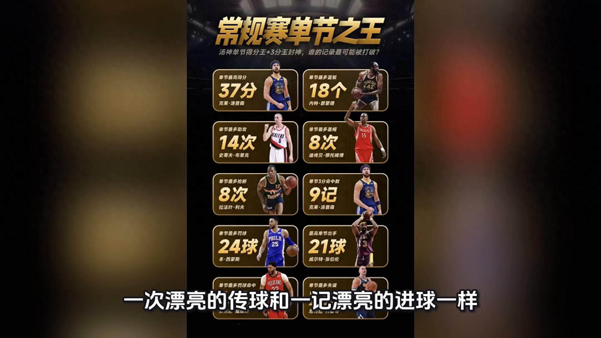 ·1、单节最高得分37分,由前勇士球员克莱汤普森创造,其中单节命中9记三分球也是一项记录。