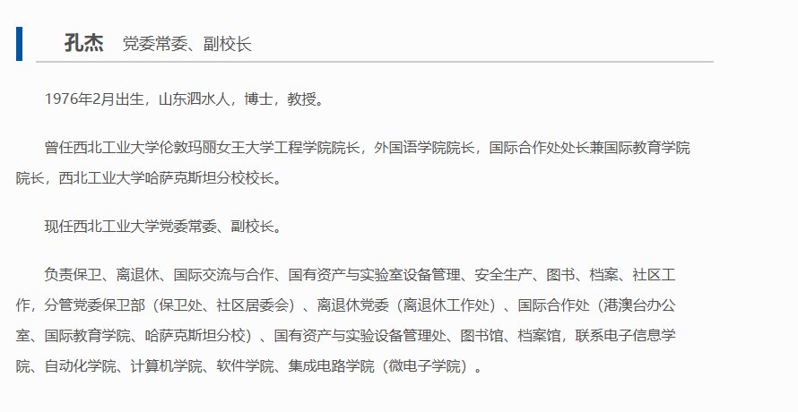 孔杰的这个安排,也是有缘由的,他之前做过西北工业大学伦敦玛丽女王大学工程学院的院长、国际合作处处长, 还兼任过哈萨克斯坦分校的校长,校内几乎找不到第二个有他那样丰富国际化办学经验的人,让他来负责国际合作, 等于把西工大最有国际化实战经验的人放到了对口岗位上。