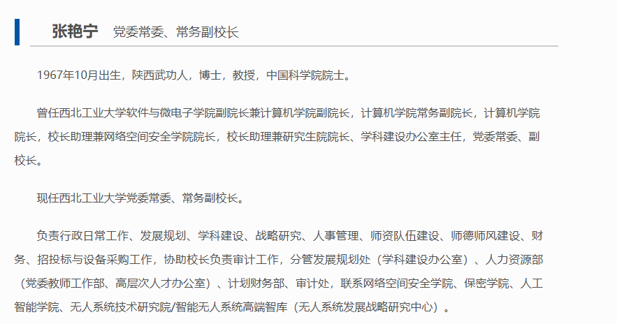 据西北工业大学官网现任领导栏目更新情况显示,中国科学院院士张艳宁已经担任党委常委、常务副校长了,国家杰青孔杰任党委常委、副校长,他俩一起到任, 一个管钱和人,一个管外和器,分工指向很明确。