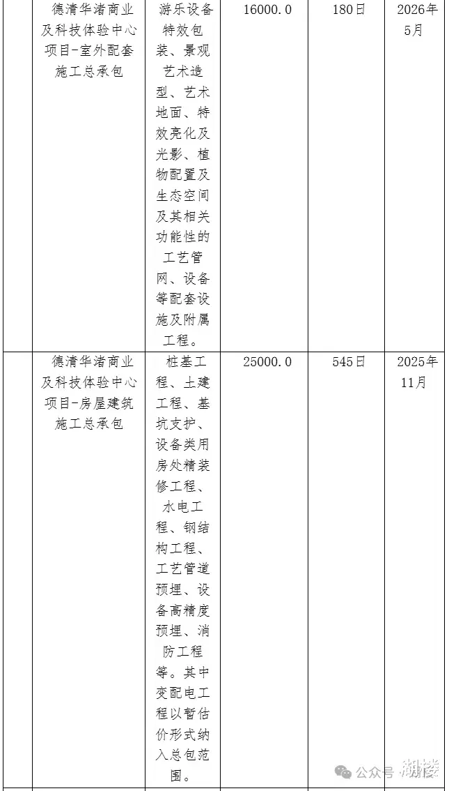今年11月,德清华渚商业及科技体验中心项目-房屋建筑施工总承包将启动招标计划;2026年5月,该项目室外配套施工总承包将启动招标计划。