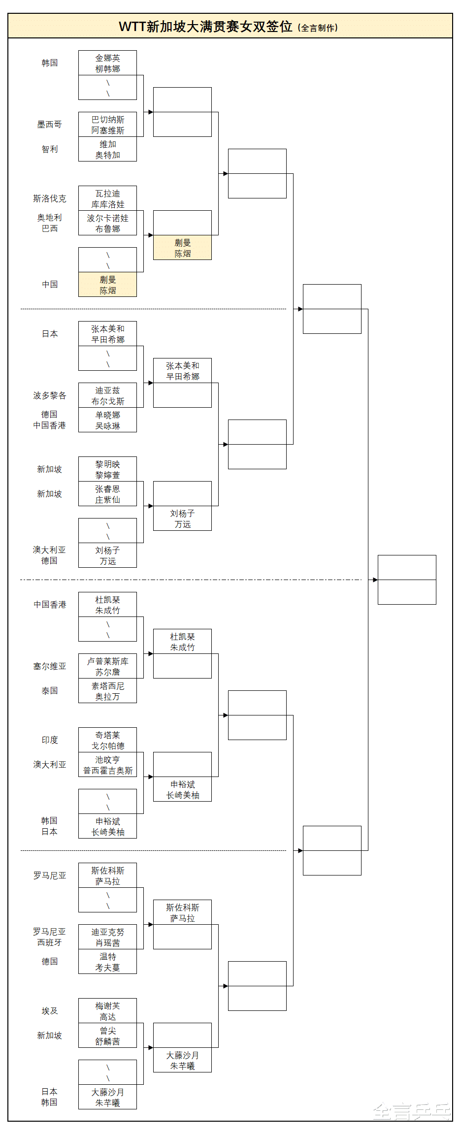 2/4区:张本美和/早田希娜(日本)VS轮空、迪亚兹/布尔戈斯(波多黎各)VS单晓娜(德国)/吴咏琳(中国香港),黎明映/黎嬣萱(新加坡)VS张睿恩/庄紫仙(新加坡)、轮空VS刘杨子(澳大利亚)/万远(德国)。