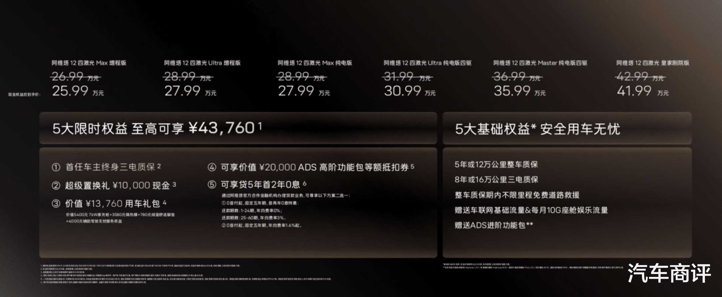 10月28日,汽车商评从阿维塔科技官方处了解到,旗下新车阿维塔12四激光版正式上市,共6个车型版本,覆盖纯电和增程双动力,官方指导价26.99万元-42.99万元,权益后到手价为25.99万元-41.99万元。