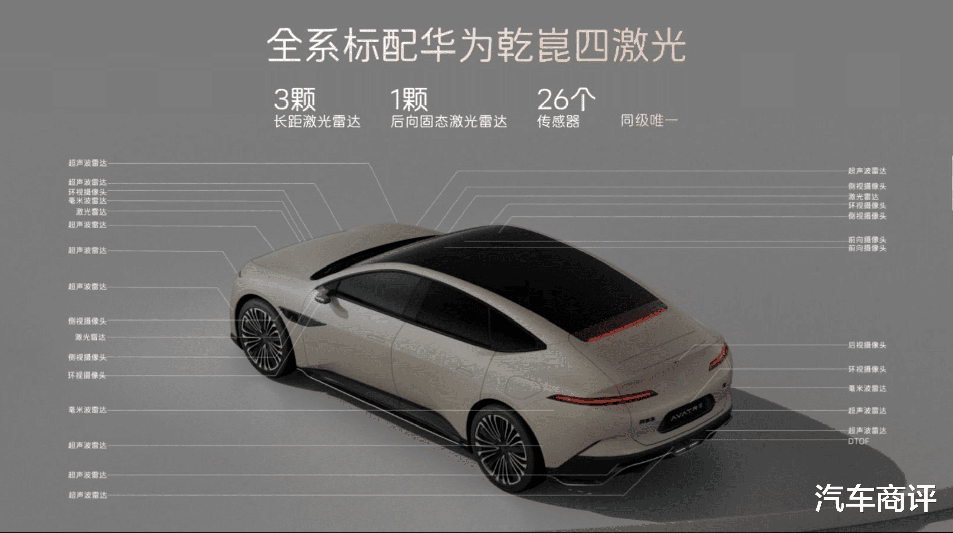 驾驶辅助是新车的升级重点,阿维塔12四激光版全系标配华为四激光雷达系统,由3颗高感知长距激光雷达与1颗后向高精度固态激光雷达构成,实现360°无死角的全域感知覆盖。