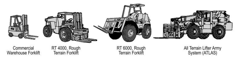 叉车用于提起、搬运和堆垛各类物资与装备。叉车型号的选择取决于载荷重量和作业地形条件。轻型叉车额定载重2000磅,最大起升高度100英寸。轻型叉车可采用汽油或电力驱动,并配装实心或半实心橡胶轮胎。可在室内及顶部净空高度较低的区域使用。