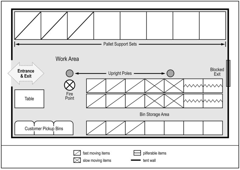 补给保障活动可能在没有永久性仓库或棚舍设施的地区展开部署。典型的帐篷布局包括作业区、托盘储存区、货架储存区、提货区,以及存放消防器材的消防点。帐篷内所需的储存器具数量与类型、可储存物资数量以及作业区域面积,取决于所保障单位的规模和需求。需要注意的是,每次建立补给点的条件都可能不同,并不存在统一的标准化布局。在规划帐篷式仓储区时,应考虑以下事项: