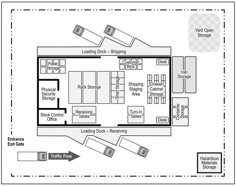 仓储空间是所有补给保障活动的最关键资源。由于可用空间通常有限,补给保障活动必须最大限度地利用所有可用空间。平面布局图是用于展示仓储区域、货架和货柜排列方式的蓝图或布局示意图,有助于管理库存,并提高物资或装备的取用速度。