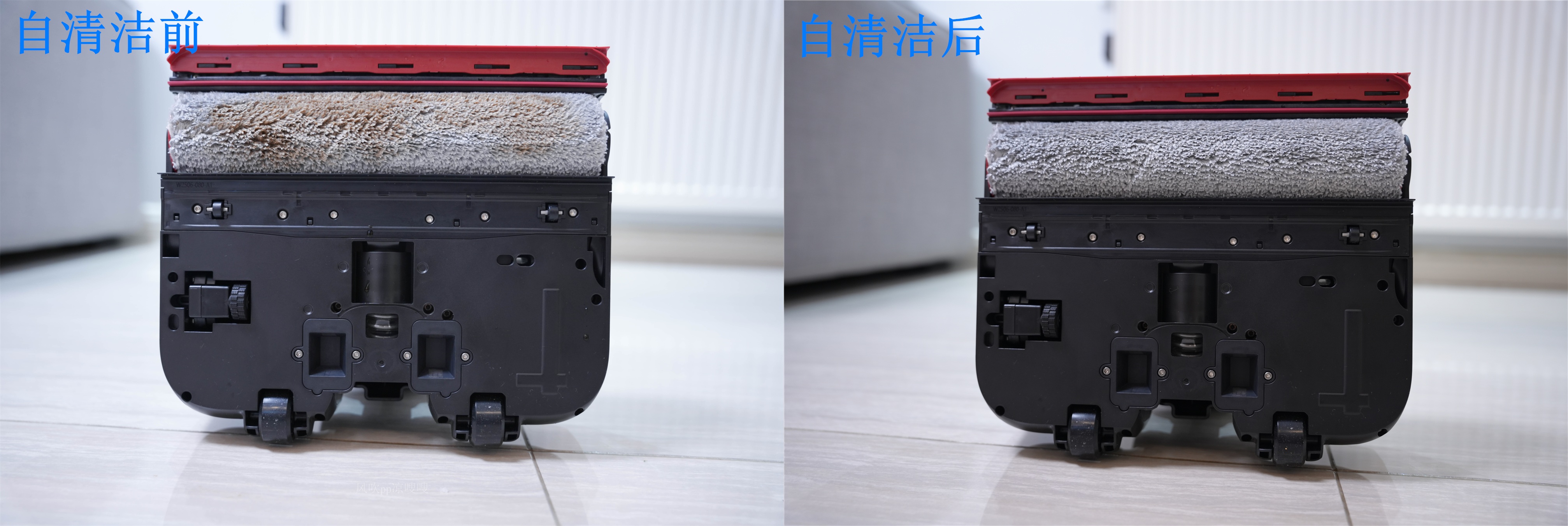 对比自清洁前后的滚刷,可以看到差异很明显,经过自清洁后滚刷很干净,有效避免了以脏拖脏。