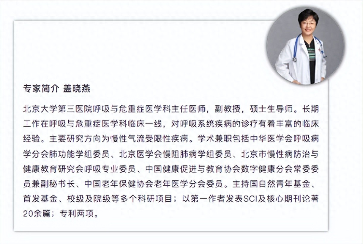 “这类呼吸慢病患者不能只盯着表面症状,而是要规范治疗原发病。第一步肯定是每次都苦口婆心劝导大家的‘彻底戒烟’,同时还要尽量避免接触二手烟、厨房油烟、装修扬尘、工地粉尘等等。支气管舒张剂也要规律用,包括发作时按需使用的短效吸入剂,和需要每日固定时间使用、长期控制气道炎症、避免病情进展的长效吸入剂。另外,大家熟悉的肺康复锻炼也要落地。”