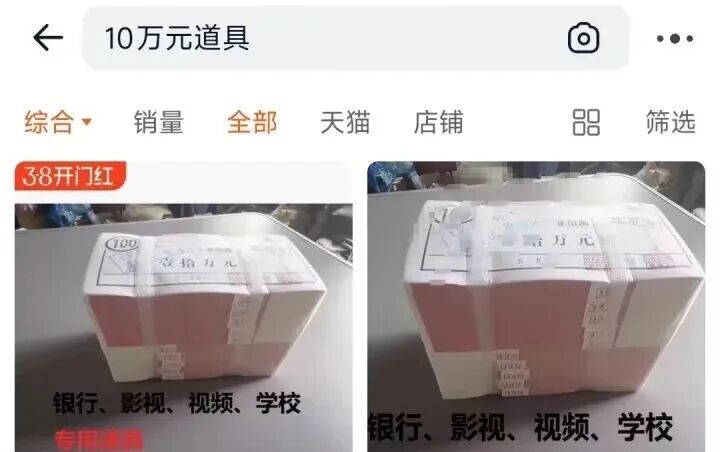 随后,姚越操在网购平台搜索“10万元道具”,出现了一批价值20—60元不等的人民币道具,他发现,有一家的道具实拍图上面也有封签和红章,“就连盖的工作人员的姓名章和行李箱里的也一模一样。”