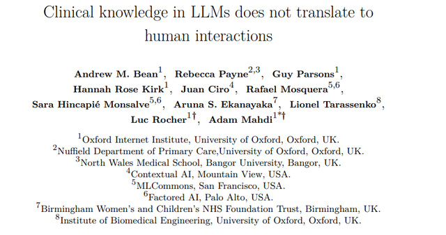 里面讲得很清楚:AI 医疗模型在标准化测试中表现惊人,甚至能和专业医生比肩;但一到真实场景,效果立刻翻车,还不如传统搜索。原因有两个:
